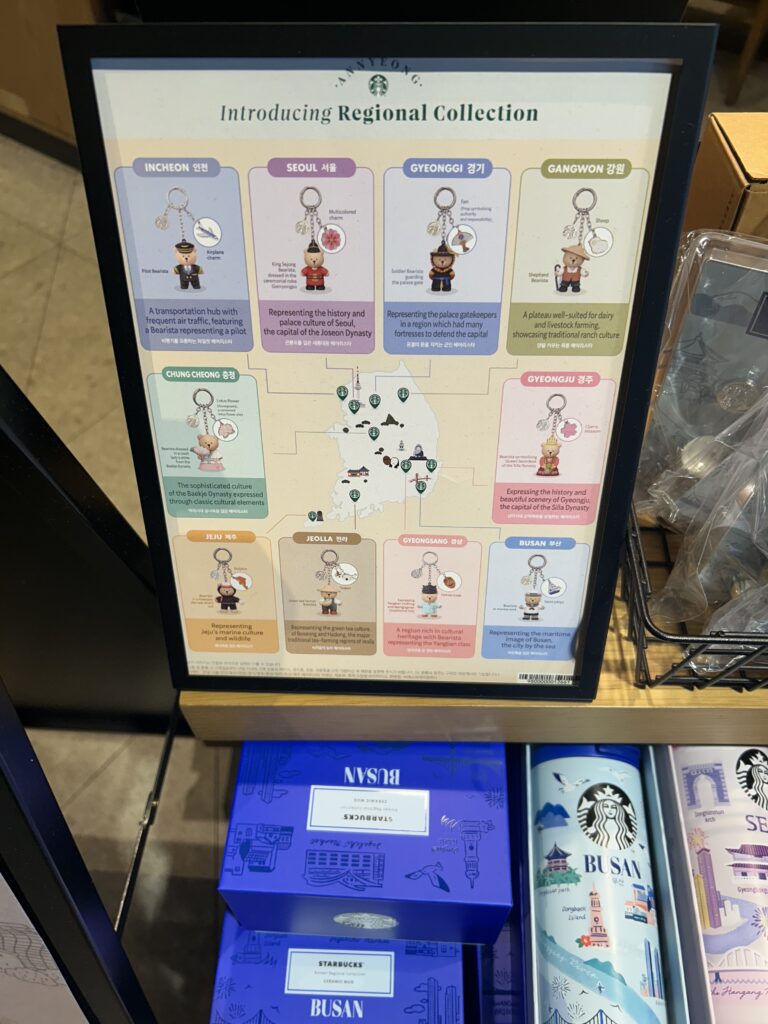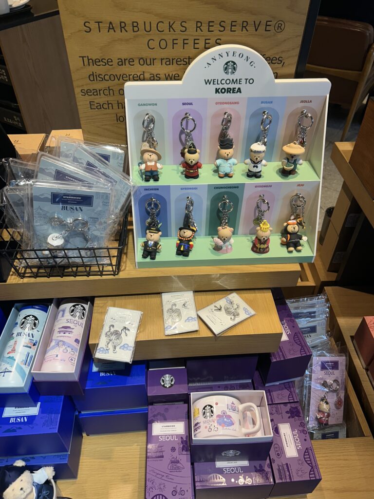 If you want Starbucks merchandise as a Korean souvenir, you can buy the regional collection items directly without stamp collecting. These Korea-exclusive products – like the adorable Bearista (bear barista) keychains representing different Korean cities – are available for purchase year-round.